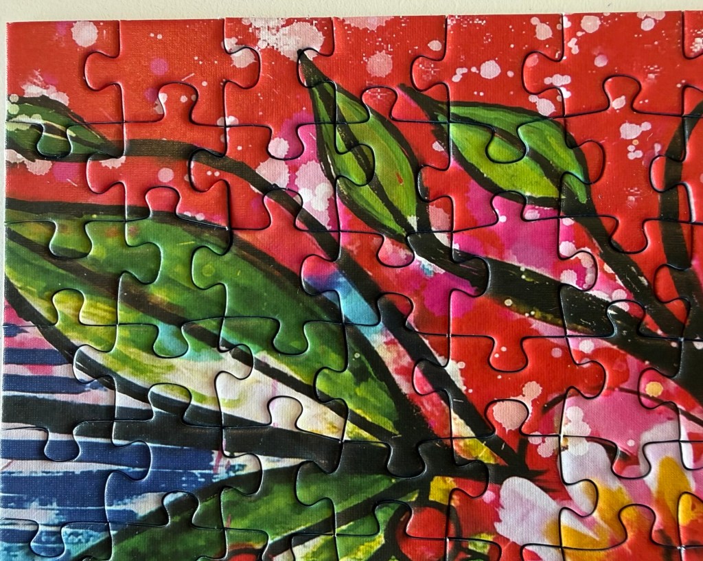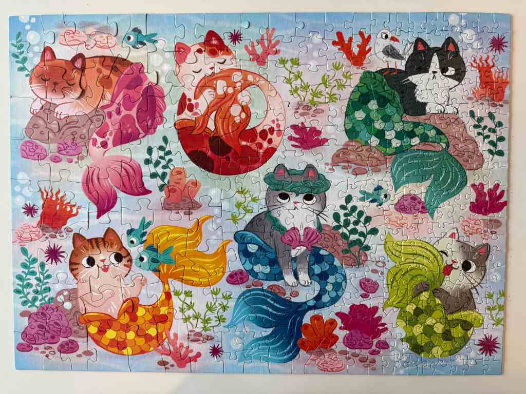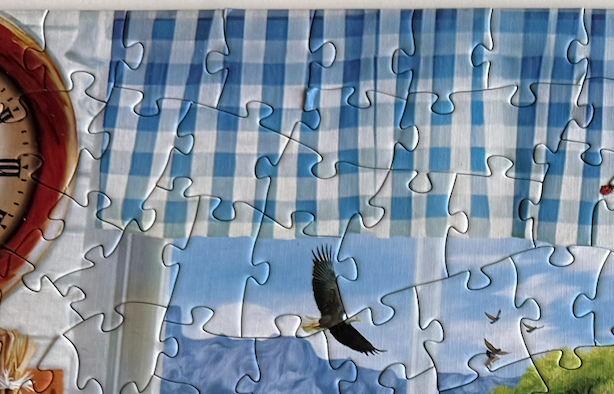Family piece puzzles use a form of random cut where the size of the pieces varies from one end to the other. This allows family members to each work on the part of the puzzle that’s best suited to them. An example of a family piece puzzle from Cobble Hill is shown below. It has large pieces on the left, medium pieces in the middle, and small pieces on the right.
