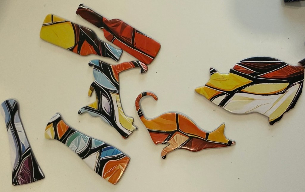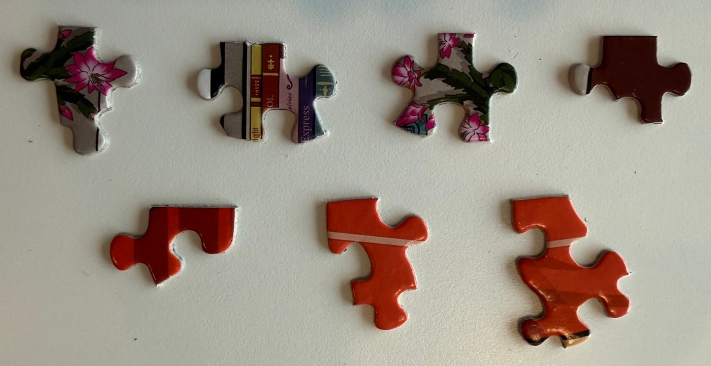 Whimsy cut puzzles are another form of random cut puzzle; they have some pieces with unusual shapes that may or may not be related to the puzzle’s art. I’ve only come across one puzzle with whimsy cut pieces, and unfortunately it wasn’t well-designed so the pieces wouldn’t stay together. But I did take a picture of its cat- and bottle-shaped pieces.