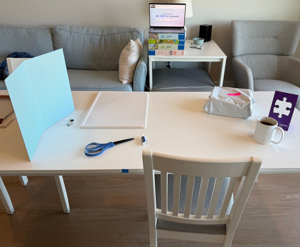 - The laptop (top center) has the Zoom app open and will provide continuous video of me and my puzzling surface throughout the event. I’m going to move my table closer to the laptop next time, but some distance is needed. I sat it on top of a pile of puzzle boxes to elevate it enough to be able to see the whole surface I’ll be using.