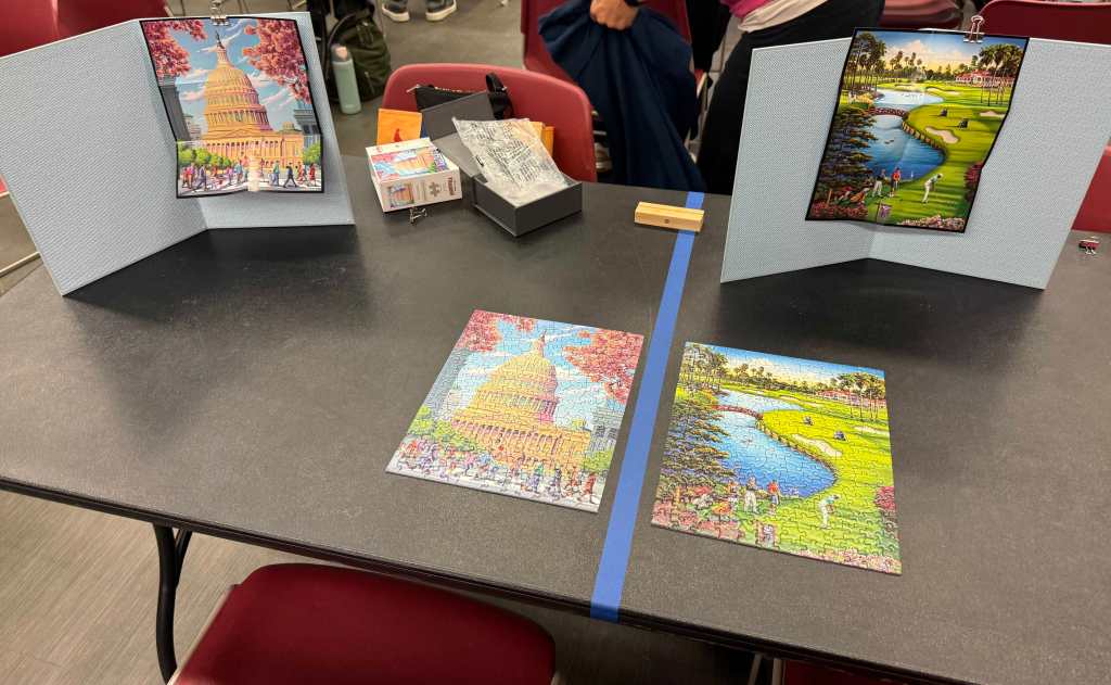 Other pairs have one person on each side of the table at opposite ends (top left and bottom right, or bottom left and top right). When “switch!” is called, each person moves to the other chair on their side of the table. The advantage of this is it minimizes the time needed to switch. The disadvantage is that the puzzles won’t be right side up at all times. Some pairs build their puzzles sideways so that no one has to work on an upside-down puzzle.