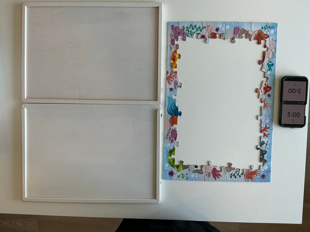 Next, the two players open the puzzle. Without any time restrictions, they flip up all the pieces, separate the edge pieces, and build the edge together. The other pieces can optionally be covered; in the picture below, the interior pieces are under the white wooden trays. And the box lid is displayed in a place that both players can see equally well.